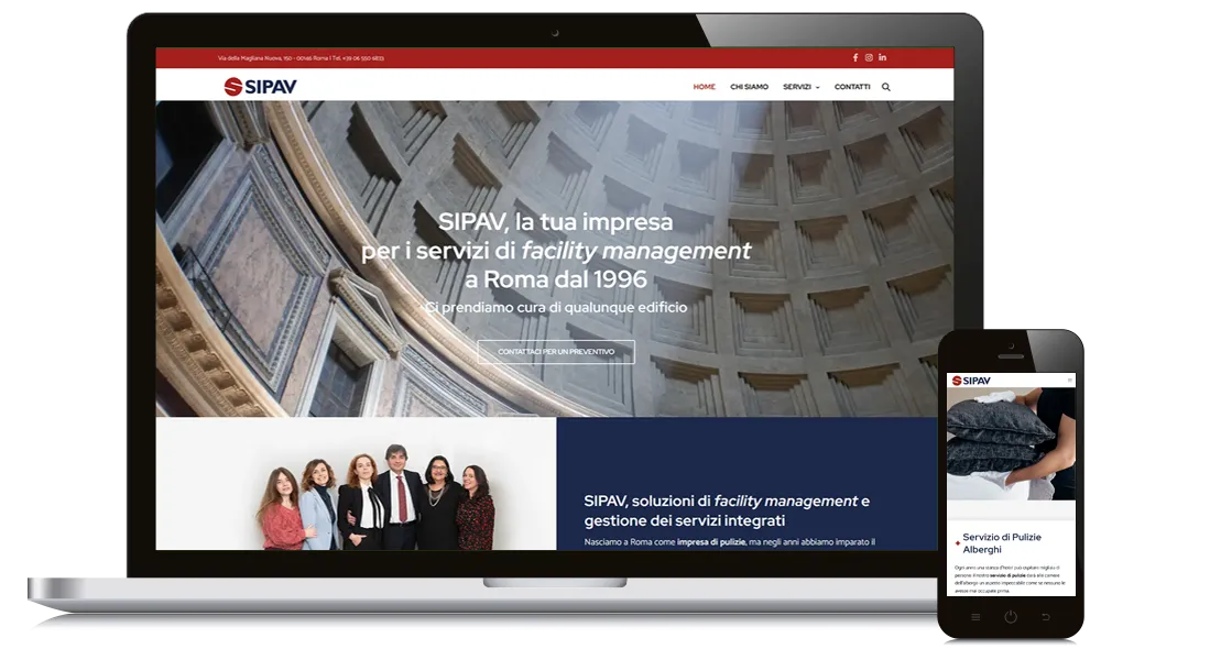 SIPAV srl è un’impresa multiservizi specializzata in pulizie civili e industriali che lavora con enti pubblici, poli museali, hotel e multinazionali. Il sito precedente raccontava i servizi in modo completo, ma la grafica non restituiva la dimensione aziendale né la professionalità che il cliente voleva comunicare.